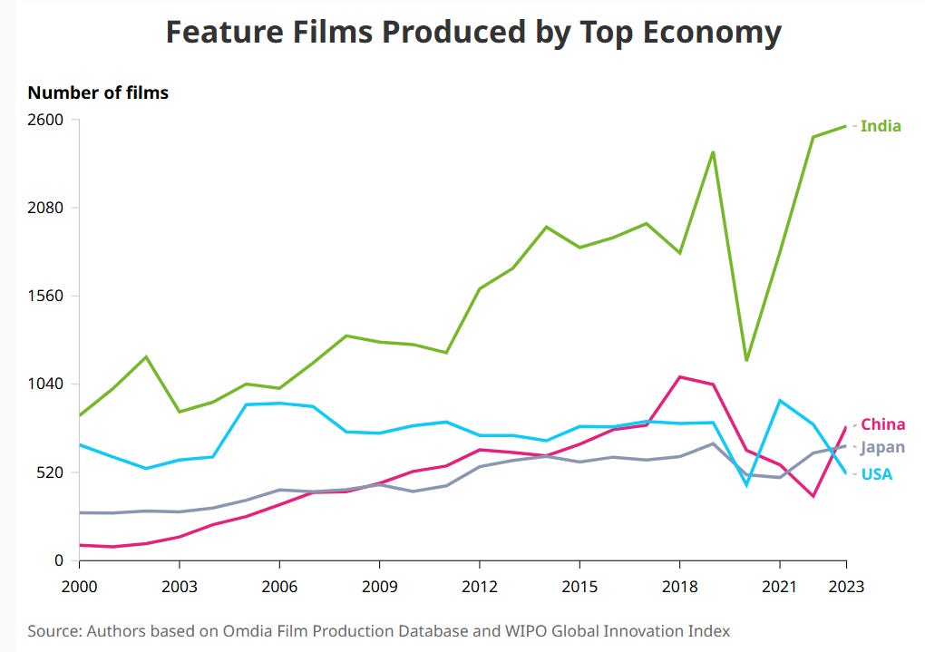 India is the world’s largest film-producing country, with over 2,500 feature films released in 2023, according to the data from WIPO. These productions span over more than 20 languages and represent a diverse spectrum of regional cultures and artistic traditions. However, India’s global film identity is still largely defined by Bollywood, despite it accounting for only about 19% of the country’s annual film output. This disconnect between India’s cinematic diversity and its international image raises key questions about how cultural capital is measured and reflected in innovation rankings.